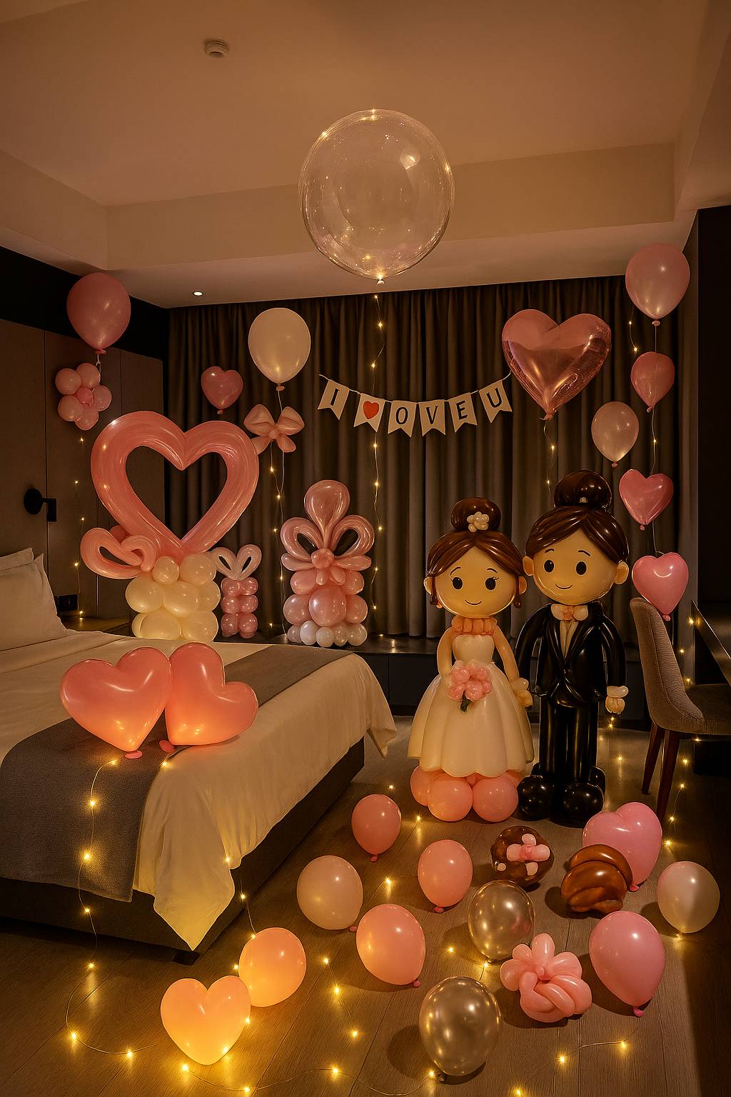 糖果屋氣球提供多款床上氣球佈置設計,可依需求客製顏色與風格,適合飯店、居家空間使用,讓重要時刻更有儀式感。